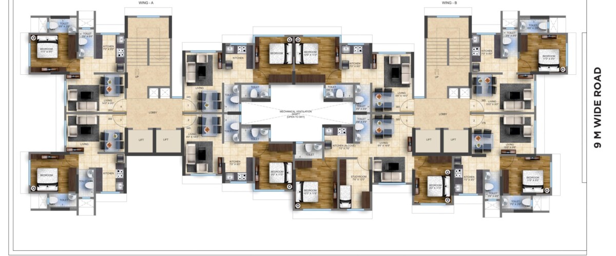 The Layout comprises of Wings A & B. Plans and Projections of Wing B, as depicted in following pages, are final and assured. Plans and Projections of Wing A, as depicted in following pages, are tentative and will be finalized at the time of its implementation.